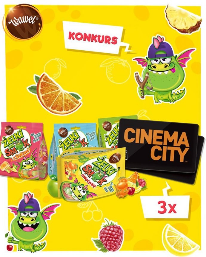 3x zestaw przygotowany przez Organizatora, który zawiera: 2 pojedyncze wejściówki do Cinema City na dowolny seans 2D o wartości 40,00 zł (słownie czterdzieści złotych 00/100) oraz 9 szt. Żelków jak Smok jogurtowych 100g, 9 szt. Żelków jak Smok kwaśnych 100g, 9 szt. Żelków jak Smok owocowych 100g, 9 szt. Żelków jak Smok z sokami 100g o łącznej wartości 115,13 zł (słownie: sto piętnaście złotych 13/100) wraz z kwotą pieniężną w wysokości 17 zł (słownie: siedemnaście złotych 0/100), to jest Nagroda o łącznej wartości 172,13 zł (słownie: sto siedemdziesiąt dwa złote 13/100)