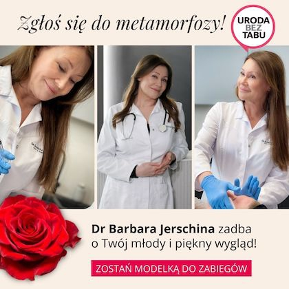 Zapraszamy serdecznie do udziału w metamorfozach z cyklu „Uroda bez tabu”! O Twój młodszy i bardziej atrakcyjny wygląd zadba dr Barbara Jerschina, lekarz medycyny estetycznej i przeciwstarzeniowej z wieloletniem doświadczeniem. W zabiegach dr Jerschina stosuje wyłącznie sprawdzone i bezpieczne preparaty oraz zaawansowane technologie hi-tech, zawsze podchodząc do poprawy wyglądu indywidualnie i kompleksowo, dzięki czemu możesz liczyć na naturalny efekt odmłodzenia i korekcji twarzy, a także świeżą, promienną, bardziej jędrną i elastyczną skórę, która po prostu wygląda pięknie. Nie czekaj, zgłoś się! Może to właśnie Ciebie dr Barbara Jerschina wybierze do metamorfozy?