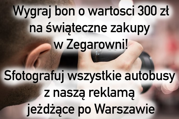 Zrób zdjęcia reklam na autobusach i wyślij je do nas na adres konkurs@zegarownia.pl wraz ze zgłoszeniem! Zwycięży osoba, której uda się uwiecznić na zdjęciach wszystkie 9 autobusów!