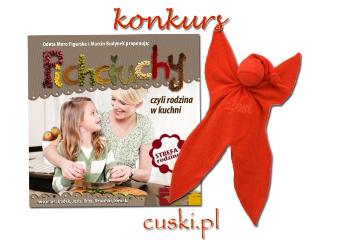Przytulanka Cuski Original (kolor czerwony) oraz książka „Pichciuchy czyli rodzina w kuchni”.