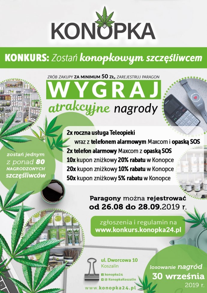 - Zrób zakupy za min. 50 zł (stacjonarnie: sklep i herbaciarnia Konopka, ul. Dworcowa 10, Koszalin lub online: www.konopka24.pl)