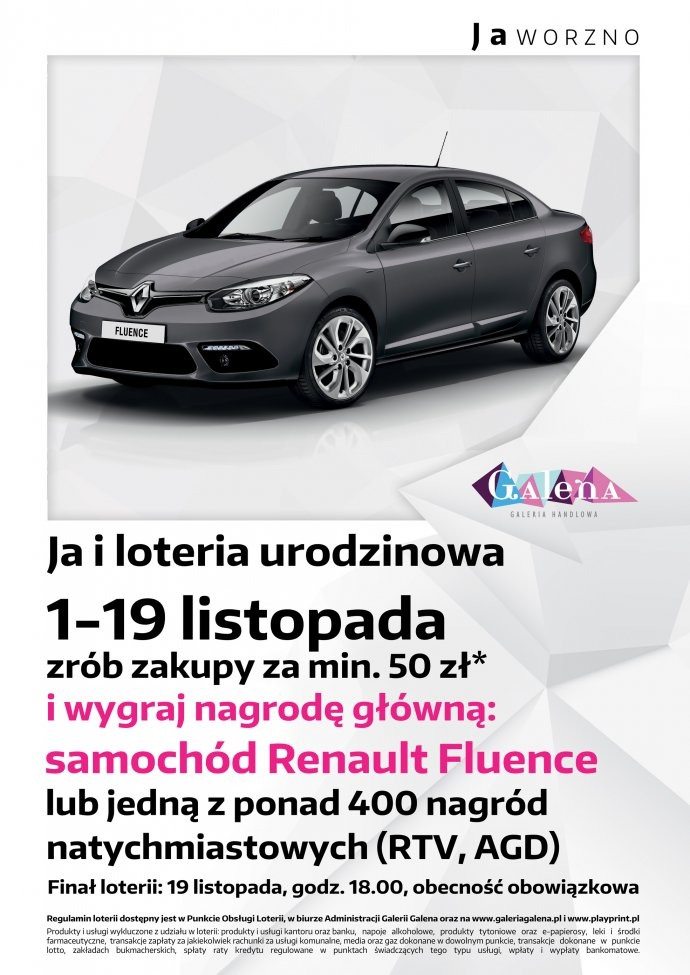 Przyjdź do Galerii Galena w dniach 1-19 listopada, zrób zakupy za min. 50 zł i zagraj o jedną z ponad 400 nagród natychmiastowych oraz nagrodę główną: RENAULT FLUENCE!