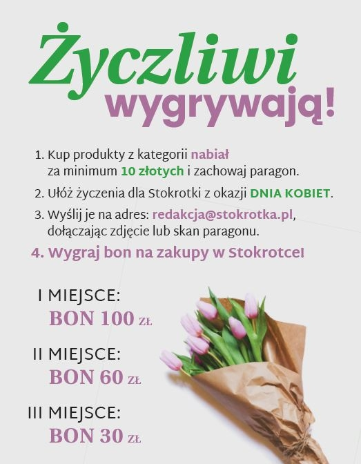 Wysłać odpowiedź wraz ze skanem bądź zdjęciem paragonu oraz danymi osobowymi w postaci: imienia,nazwiska,adresu zamieszkania (nazwy miejscowości, ulicy i kodu pocztowego) na adres mailowy: redakcja@stokrotka.pl.