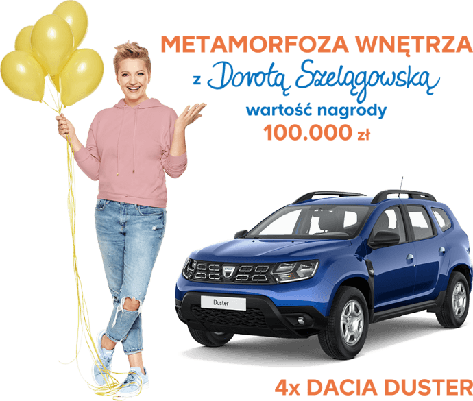 - Zarejestruj swój paragon lub fakturę w formularzu na stronie lub w aplikacji mobilnej aby grać o 1 z 4 Dacia Duster i Metamorfozę wnętrza z Dorotą Szelągowską!