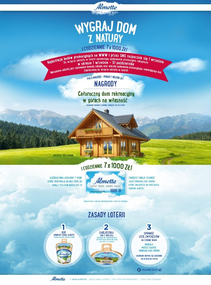 Zakupić promocyjne opakowanie serka Almette, zachować wieczko i paragon oraz zgłosić swój kod poprzez sms wysyłając go na numer 71200 o treści Dom.kod