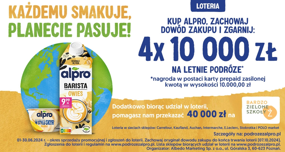 - Kup dowolny produkt Alpro w sieci Carrefour, Kaufland, Auchan, Intermarche, E.Leclerc, Stokrotka lub POLOmarket
