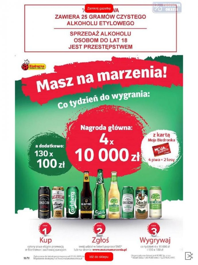 07.06.2019 18:43:169.2. W Loterii biorą udział następujące produkty Carslberg Polska Sp. z o.o.: Kasztelan puszka 0,5l, Okocim Jasne Okocimskie puszka 0,5l, Okocim Mocne Dubeltowe puszka 0,5l, Somersby butelka 0,4 (warianty Apple, Blackberry, Watermelon, Mango), Okocim Radler 0,0% puszka 0,33l (Grapefruit, Jabłko z czereśnią), Carlsberg butelka 0,5l, Karmi butelka 0,4l (Classic), Zatecky Svetly Lezak puszka 0,5l, Okocim Radler puszka 0,5l (Grejpfrut, Limonka, Truskawka z pigwą, Malina z borówką amerykańską, Owoce leśne), Birell puszka 0,5 (Lager, Witbier), Somersby butelka 0,4l Pear 0.0%, Somersby puszka 0,5l (warianty smakowe: Apple, Blackberry, Elderflower, Watermelon, Mango, Pear 0,0%), Carlsberg puszka 0,5l (dalej „Produkty promocyjne”).