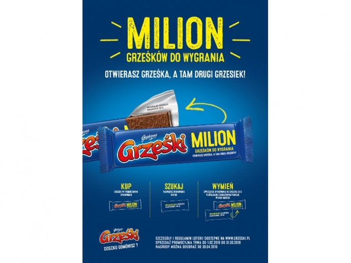 Dokonaj zakupu wafelka Grześki w promocyjnym opakowaniu. Jeśli znajdziesz napis„Wygrałeś Grześki kakaowe 36 g”, otrzymsza taki sam wafelek gratis. W puli produktów do rozdania znalazł się okrągły milion Grześków.