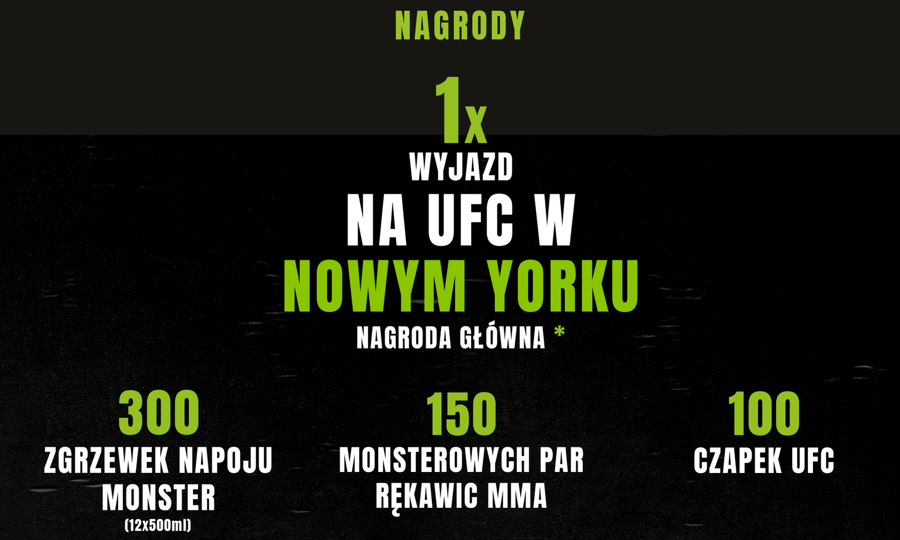 - 1x wyjazd na UFC w Nowym Jorku (wartość 30 000 PLN)