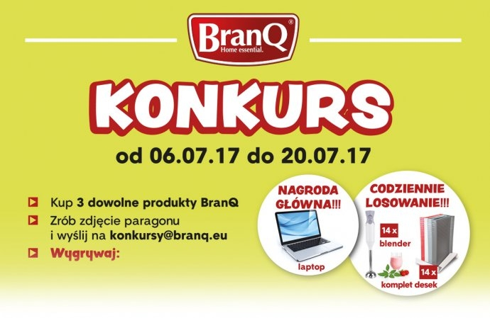Warunkiem udziału w konkursie jest zakup 3 dowolnych produktów firmy BranQ w sklepach Kaufland, sfotografowanie lub zeskanowanie paragonu z tymi produktami i przesłanie go na adres konkursy@branq.eu .