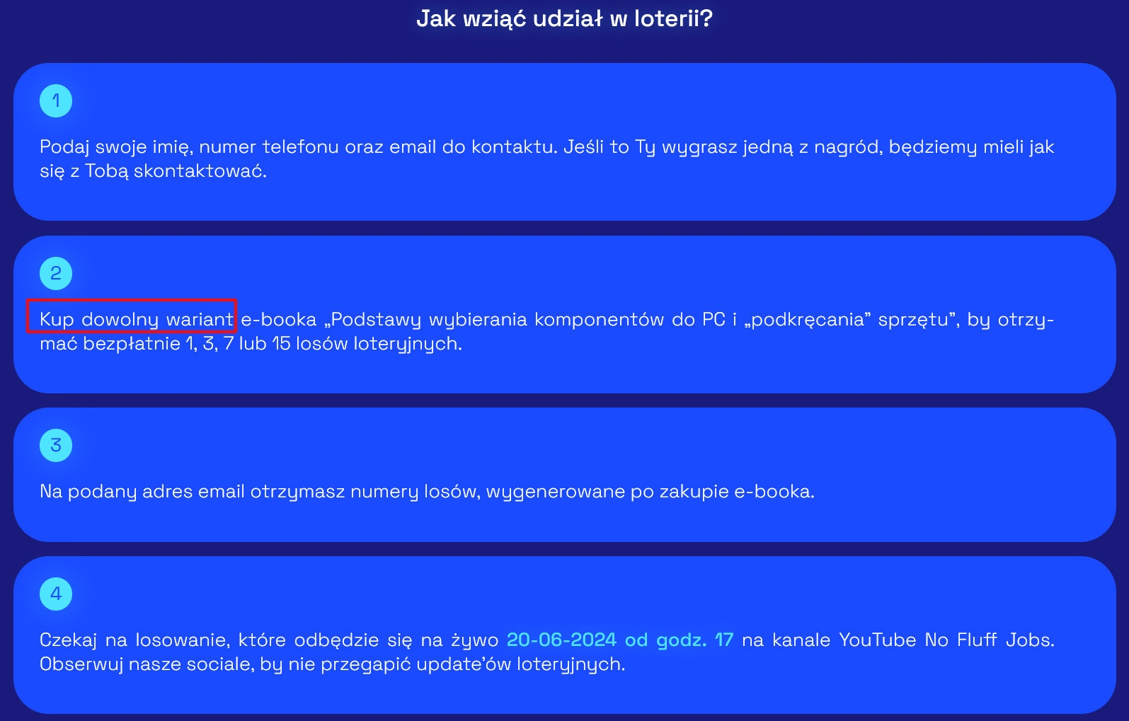 W terminie 21.05-20.06.2024 uzupełnij dane kontaktowe, a następnie kup dowolny wariant e-booka „Podstawy wybierania komponentów do PC i „podkręcania” sprzętu”, by otrzymać bezpłatnie 1, 3, 7 lub 15 losów loteryjnych.