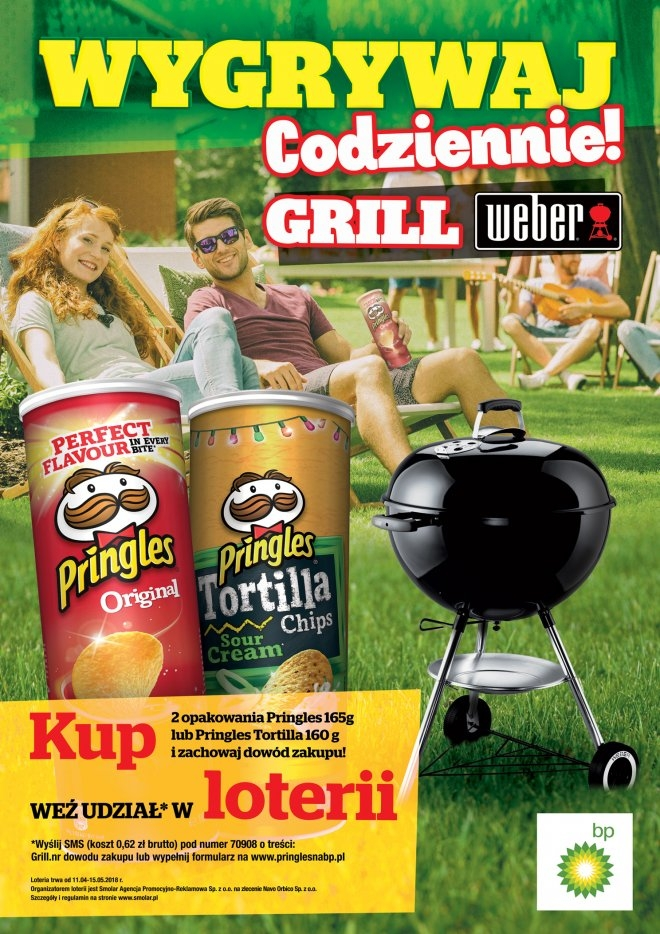 Na dowolnej stacji BP należy dokonać zakupu minimum 2 dowolnych opakowań chipsów marki Pringles 165 g i/lub Pringles Tortilla 160 g i następnie wysłać sms: GRILL.nr paragonu pod numer 70908