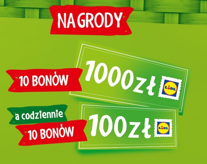 - 200 bonów towarowych LIDL o wartości 100 zł każdy (w ogólnym opisie mowa jest o 100 bonach po 100,- zł, ale w regulaminie jest 200)