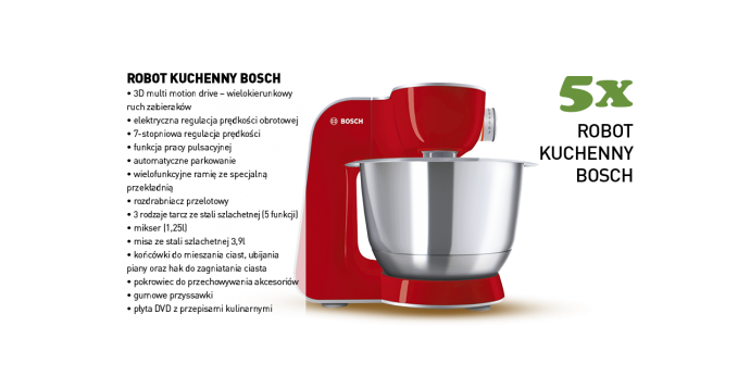 - Nagroda I stopnia: robot kuchenny Bosch o wartości: 965,00 zł (słownie: dziewięćset sześćdziesiąt pięć złotych i 00/100) brutto. Organizator przewidział 5 (słownie: pięć) nagród I stopnia w Loterii