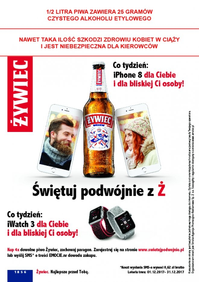 Kup 4x dowolne piwo Żywiec i zachowaj dowód zakupu (paragon). Zgłoś się do loterii wypełniając formularz na stronie swietujpodwojnie.pl lub wyślij SMS pod numer 70908 o treści według wzoru: Emocje.nr dowodu zakupu.