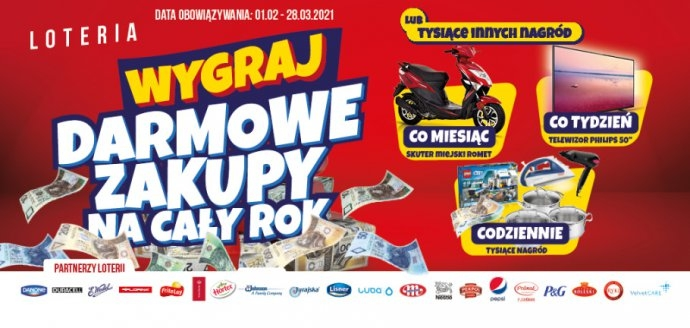 Zrób w Topaz dowolne zakupy za min. 50zł, lub za 10 zł oznaczone logo loterii,odbierz przy kasie kupon loteryjny i zarejestruj go na stronie loteriatopaz.pl