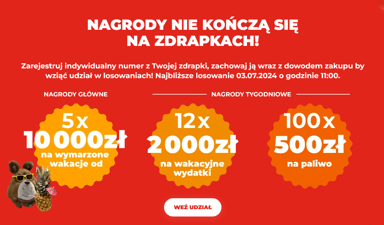 Zatankuj na Circle K min. 20 l paliwa lub kup produkty z naszej oferty sklepowej za min. 15 zł. Dla posiadaczy karty EXTRA dodatkowy bonus - liczba zdrapek loteryjnych zostanie powiększona o jeszcze jeden kupon! Sprawdzaj czy wygrałeś nagrody rzeczowe i rejestruj kody, by grać o nagrody tygodniowe lub główne
