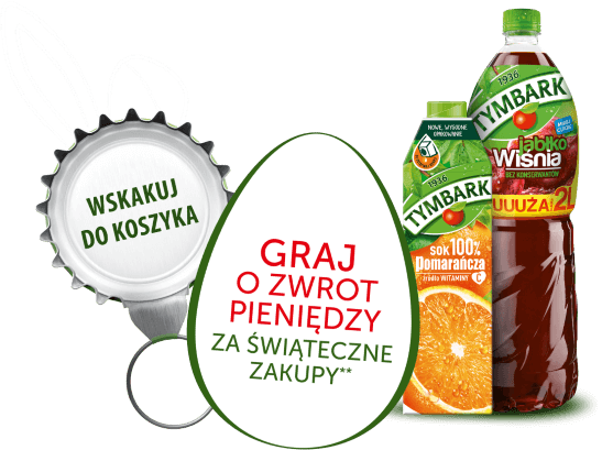Kup dowolne produkty Tymbark jednorazowo za min. 15zł, zarejestruj paragon i graj o zwrot pieniędzy za świąteczne zakupy (kwota zwrotu to max.200zł; pula zwrotów jest ograniczona i wynosi w sumie 100.000zł)