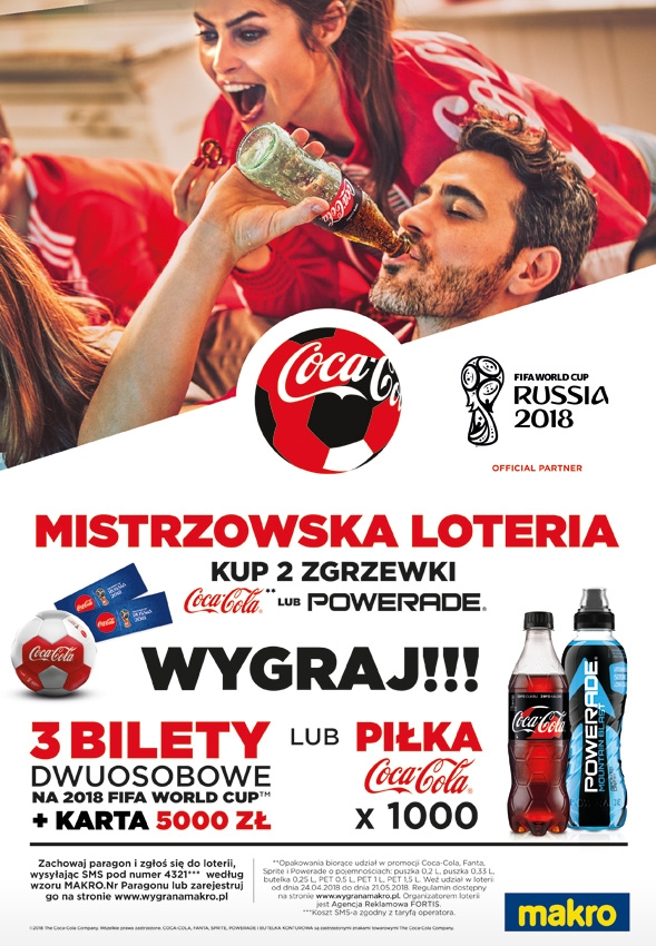 - Kup jednorazowo co najmniej 2 zgrzewki napojów: Coca-Cola, Fanta, Sprite, Powerade w puszkach lub butelkach o pojemnościach: 0,2 L; 0,25 L; 0,33 L; 0,5 L; 1,0 L; 1,5 L.