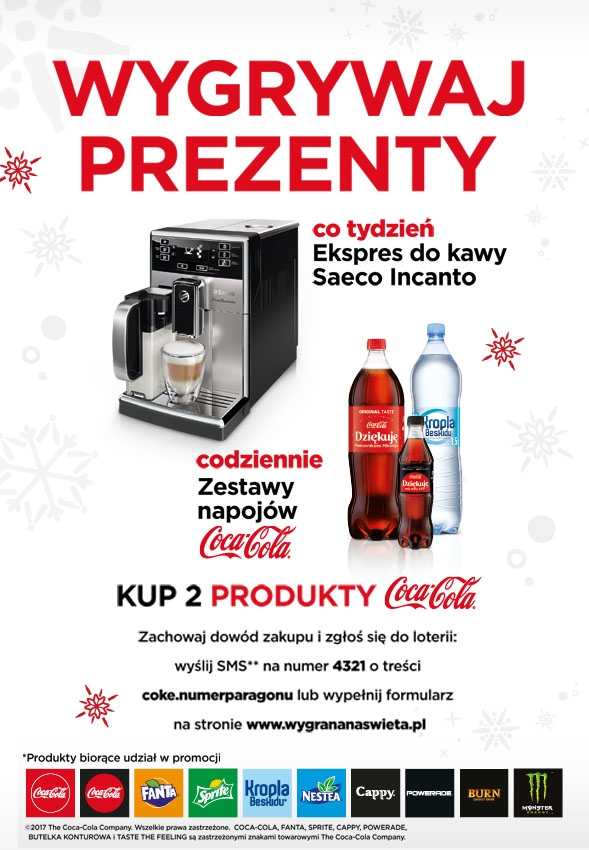 - poprzez wysłanie wiadomości tekstowej SMS pod numer 4321 wpisując w treści SMSa: słowo „COKE” oraz numer paragonu