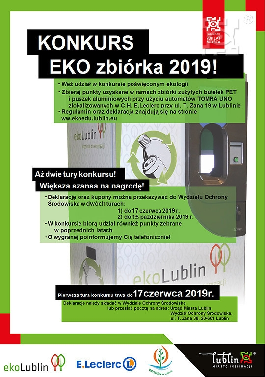 W celu wzięcia udziału w Konkursie, należy dostarczyć do Wydziału Ochrony Środowiska Urzędu Miasta Lublin z siedzibą ul. T. Zana 38, 20-601 Lublin (w przypadku wysyłki pocztą decyduje data wpływu do Urzędu Miasta Lublin) deklarację przystąpienia do konkursu wraz z kuponami, jakie dotychczas zostały zgromadzone podczas akcji zbiórki zużytych opakowań po napojach przy pomocy automatów TOMRA UNO zlokalizowanych w C.H. E. Leclerc.