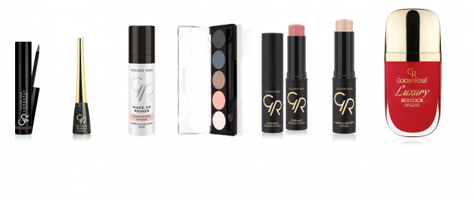 1 zestaw kosmetyków Golden Rose (lukusowy błyszczyk do ust, rozświetlacz w sztyfcie, róż w sztyfcie, paletka cieni do powiek, baza rozświetlająca, eyeliner z połyskującymi drobinkami oraz liner do brwi)