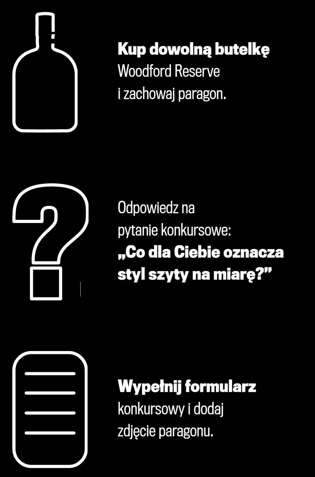 Aby Zgłoszenie Konkursowe było ważne, Uczestnik musi w Czasie Trwania Konkursu zakupić w sklepie na terenie Polski co najmniej jedną sztukę produktu (dowolną wersję) Woodford Reserve, zachować paragon za zakup, a następnie wraz ze Zgłoszeniem Konkursowym wgrać zdjęcie lub skan paragonu poprzez formularz dostępny na Stronie Konkursowej.