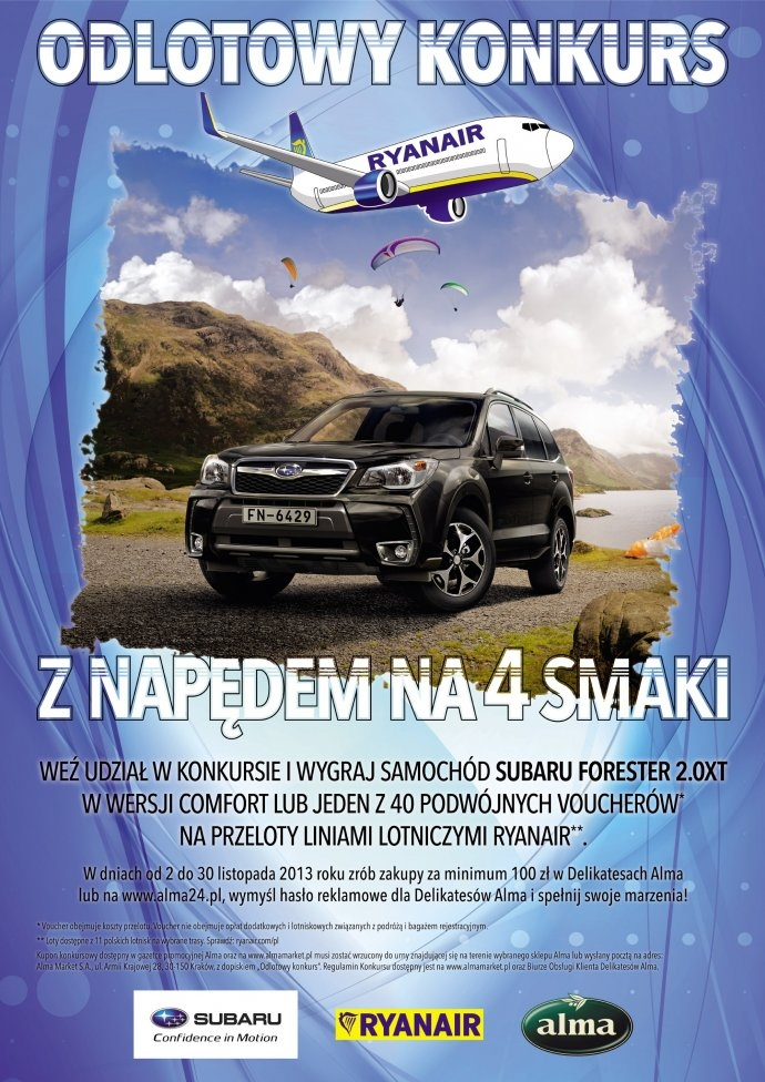 samochód Subaru Forester 2.0XT w wersji Comfort lub jeden z 40 podwójnych Voucherów na przeloty liniami lotniczymi Ryanair.