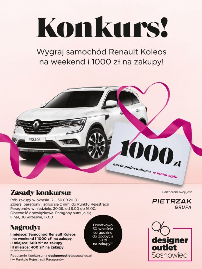 - Miejsce I: 1000 zł na karcie podarunkowej Designer Outlet Sosnowiec oraz samochód marki Renault Koleos na weekend