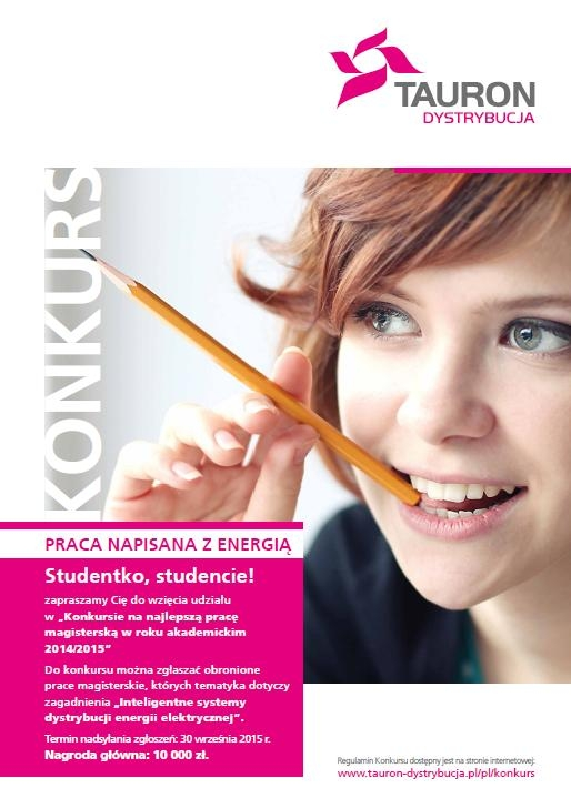30 września 2015 roku – tę datę powinni zapamiętać wszyscy studenci, którzy chcą swoją pracę magisterską poddać profesjonalnej ocenie jury składającego się z przedstawicieli świata nauki i z TAURON Dystrybucja. Tematem przewodni tegorocznej edycji konkursu na najlepszą pracę są „Inteligentne systemy dystrybucji energii elektrycznej”. Na jego zwycięzcę czeka nagroda w wysokości 10 tysięcy złotych.