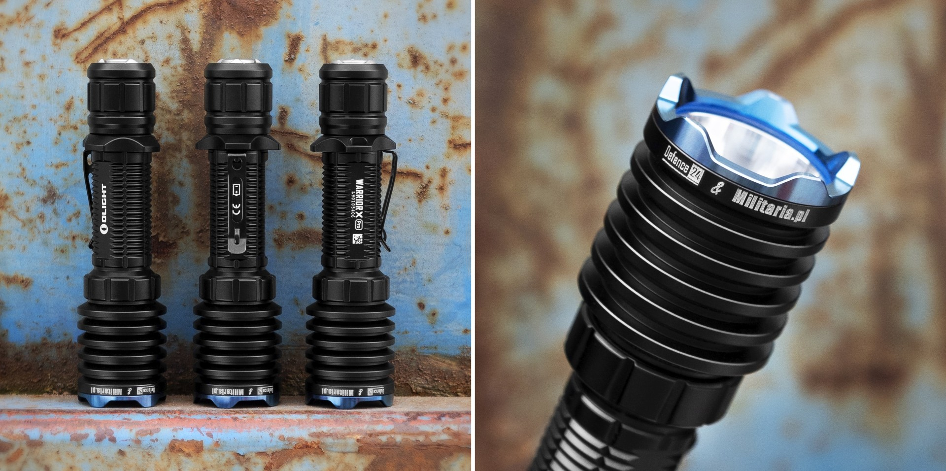 3 x unikalna latarka Olight Warrior X Pro z logotypami Defence24 oraz Militaria.pl na głowicy.