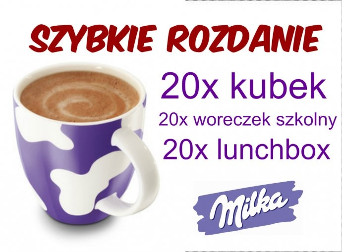 Piątek-ulubiony dzień tygodnia każdego z nas, nie może obejść się bez niespodzianek. Dlatego startujemy z szybkim rozdaniem, tym razem wśród wszystkich naszych klientów rozdamy 20 zestawów firmy "Milka". (elegancki kubek, lunch box, woreczki szkolne).