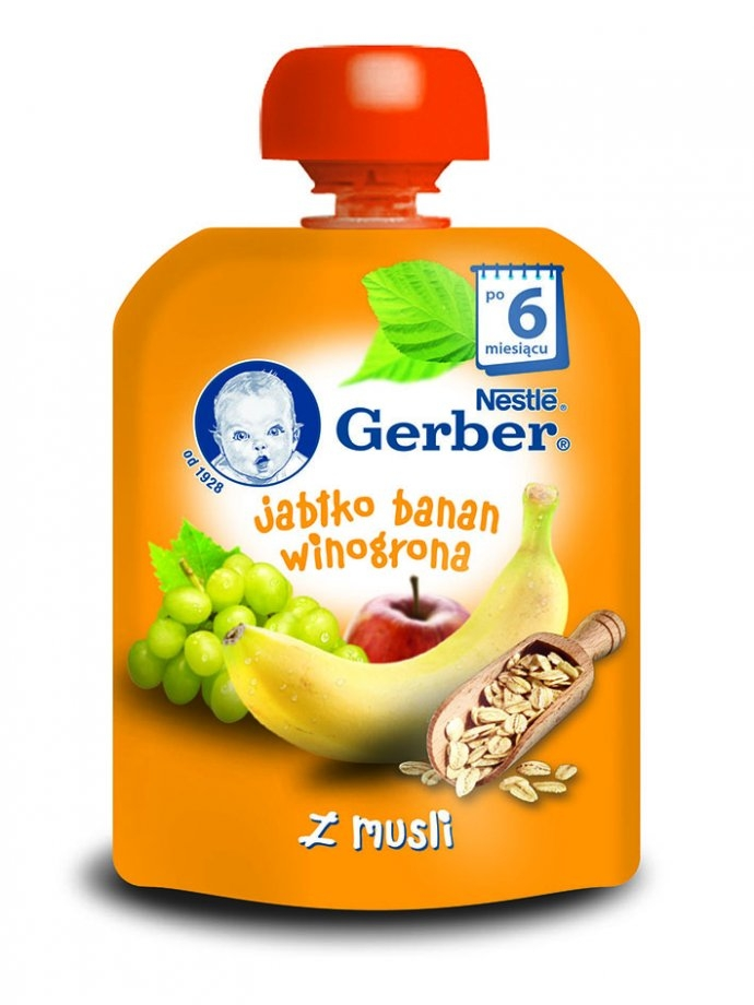- Owocowy deserek w tubce GERBER Jabłko, banan, winogrona z musli;