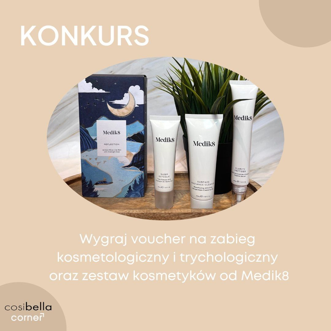 - 1 MIEJSCE: voucher na zabieg kosmetologiczny i trychologiczny oraz zestaw kosmetyków od Medik8