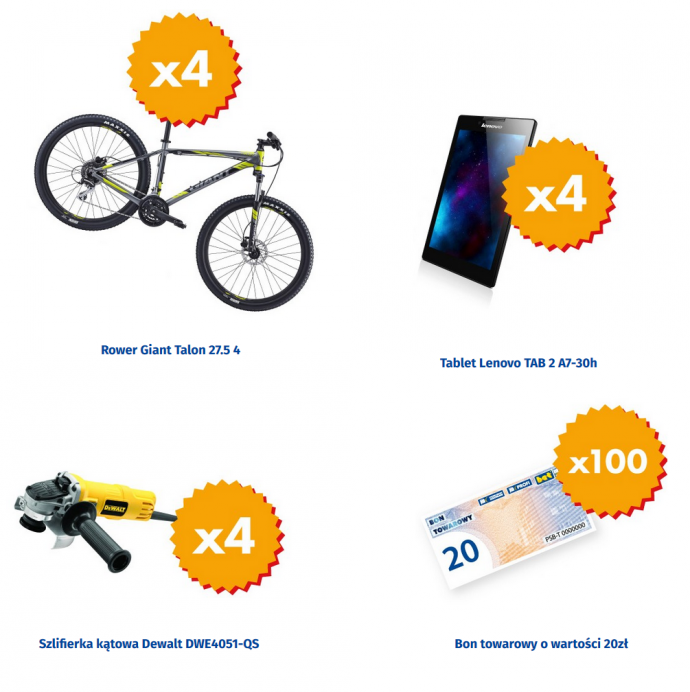4 rowery, 4 tablety, 4 szlifierki, 20 bonów po 100 zł