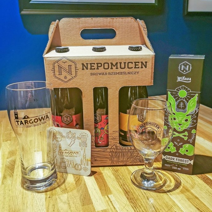 6-ściopak piw Browar Nepomucen, firmowe szkła Napomucena i Targowej, drewniana, grawerowana podkładka Targowej. Dodatkowo do najciekawszego komentarza dorzucimy butelkę Dark Forest (Imperial Forest Baltic Porter 9,3% - Nepomucen & Widawa)!