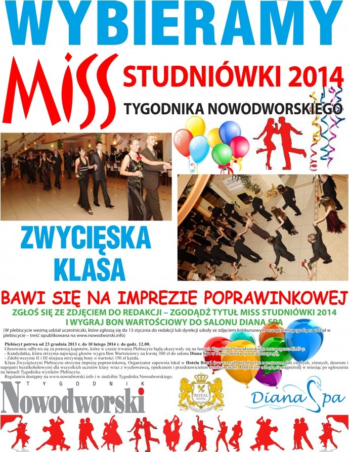 ZGŁOŚ SIĘ ZE ZDJĘCIEM DO REDAKCJI – ZDOBĄDŹ TYTUŁ MISS STUDNIÓWKI 2014 I WYGRAJ BON WARTOŚCIOWY DO SALONU DIANA SPA (W plebiscycie wezmą udział uczestniczki, które zgłoszą się do 13 stycznia do redakcji lub dyrekcji szkoły ze zdjęciem konkursowym oraz pisemną zgodą na udział w plebiscycie – treść opublikowana na www.nowodworski.info)