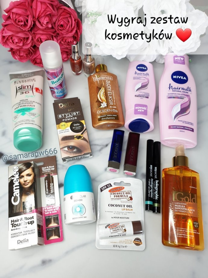 16 kosmetyków do pielęgnacji i makijażu - serum i mgiełka samoopalająca Eveline, Batiste XXL, olejek Bielenda, szampon i odżywka Nivea, 2 cienie holograficzne MySecret, 2 lakiery i 2 pomadki Sensique, balsam do ust Palmer's, dezodorant BasicLab, pomada do brwi i sztyft na odrosty Delia.