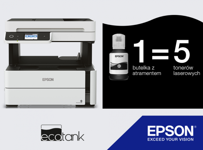 5 egzemplarzy drukarek EcoTank Mono Epson ET-M3170 w pakiecie z zestawem tuszów, pozwalających wydrukować do 11 tysięcy stron.