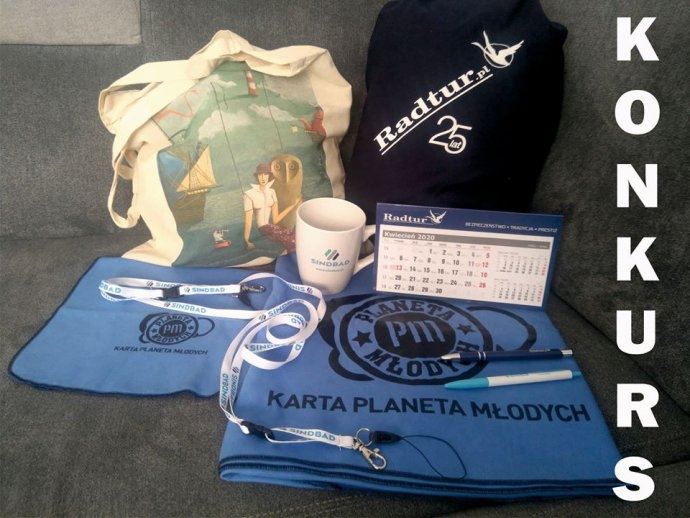 3 zestawy gadżetów (worek żeglarski, torba na zakupy, koc plażowy, ręcznik, kubek, smycze, długopisy i kalendarz)