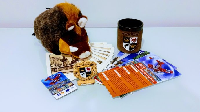 Pakiet gadżetów ze Świdnicy: pluszowy dzik, kubek z logo miasta, magnesy, zestaw pocztówek i ulotek.