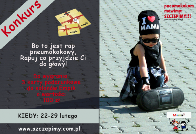 Zadaniem konkursowym jest przygotowanie krótkiej rymowanki dot. szczepień przeciwko pneumokokom. Zadanie to można zrealizować na dwa sposoby: napisać wierszyk lub nakręcić krótki filmik, na którym recytujemy, rapujemy albo śpiewamy swój własny tekst o pneumokokach. Zgłoszenie otaguj hasłem #RapPneumokokowy #RapujCoPrzyjdzieCiDoGlowy #Szczepimy