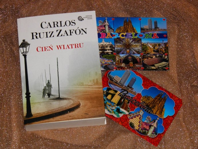 Książka Carlos Ruiz Zafon " Cień wiatru" oraz pocztówki z Barcelony