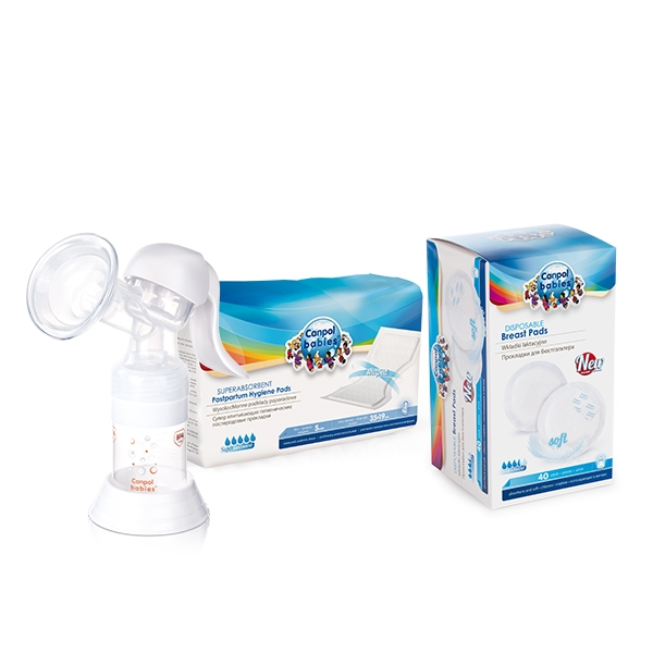 Laktator "Basic" firmy Canpol Babies wraz z zestawem wkładek laktacyjnych oraz podkładów poporodowych.