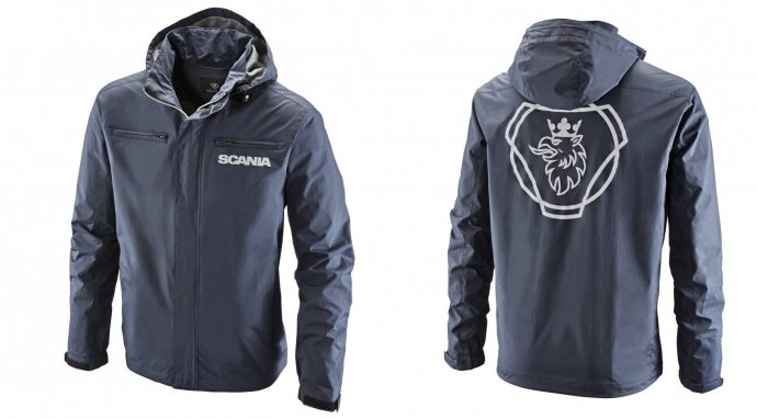 Niebieska kurtka SCANIA przeciwdeszczowa z kapturem, który można schować do kołnierza.