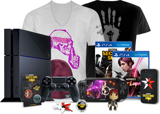 - Futerał na telefon, otwieracz do butelek, przypinki i monetę kolekcjonerską inFAMOUS Second Son.