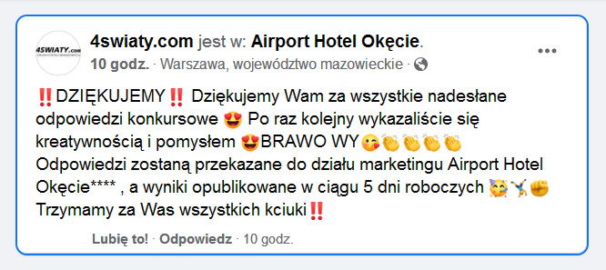 UWAGA: W konkursie pod uwagę będą brani tylko Facebookowi fani Hotelu Airport Okęcie oraz 4swiaty.com - dlatego ten konkurs umieszczam w kategorii "Facebook", choć samo zgłoszenie należy wysłać mailem.