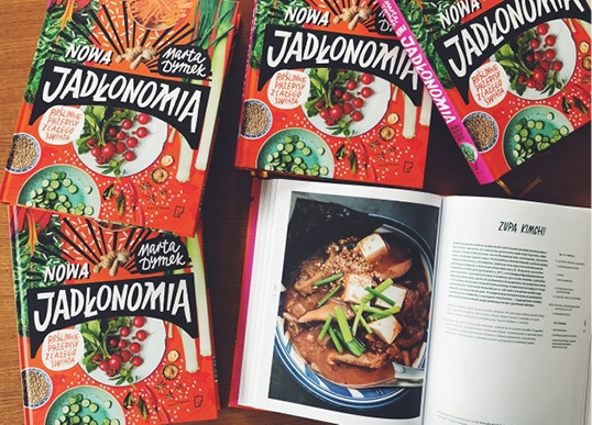 trzy egzemplarze książki "Nowa Jadłonomia, czyli roślinne przepisy z całego świata"