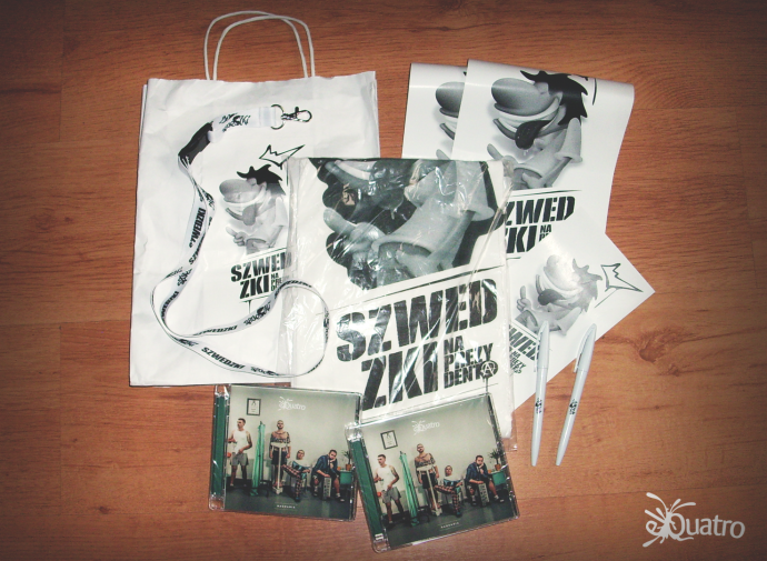 1 x koszulka z mocno limitowanej kolekcji, długopisy, wlepki i smycze sygnowane Szwedzkim oraz dwa kompakty.