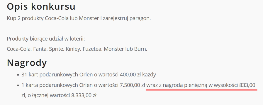 - 1 karta podarunkowych Orlen o wartości 7.500,00 zł wraz z nagrodą pieniężną w wysokości 833,00 zł, o łącznej wartości 8.333,00 zł